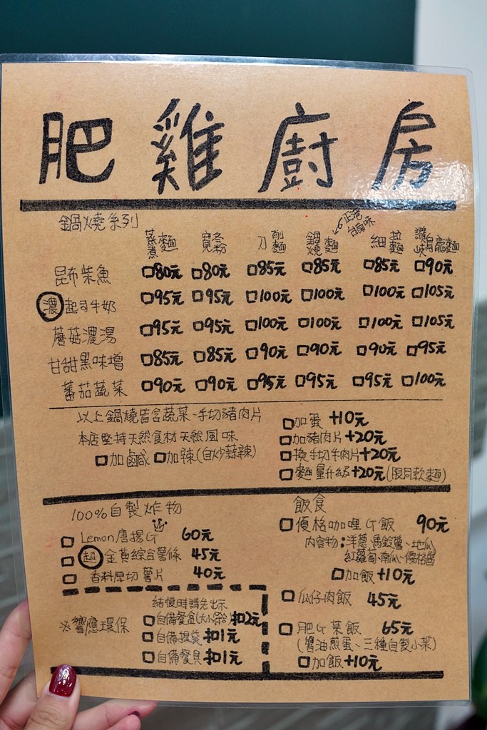 提供五種風味湯頭的鍋燒麵,麵條有六種選擇,可交互搭配,每款鍋燒麵均含蔬菜、手切豬肉片,堅持天然食材熬煮而成,以及百分百自製炸物、優格咖哩雞飯、瓜仔肉飯、菜飯(蔬食),另外還有需至少兩天前預訂的便當,數量有限、建議電話詢問!