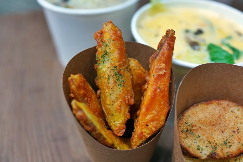 薯條是用自己切的地瓜跟馬鈴薯裹上金黃粉漿現炸,金黃粉漿的香料粉跟唐揚雞差不多,差在沒有檸檬汁,所以炸出來的顏色也跟一般薯條不太一樣,我覺得薯條口感很飽滿,無論馬鈴薯或地瓜都好好吃,重點是外皮好酥脆喔,而且冷掉依舊保有脆度。