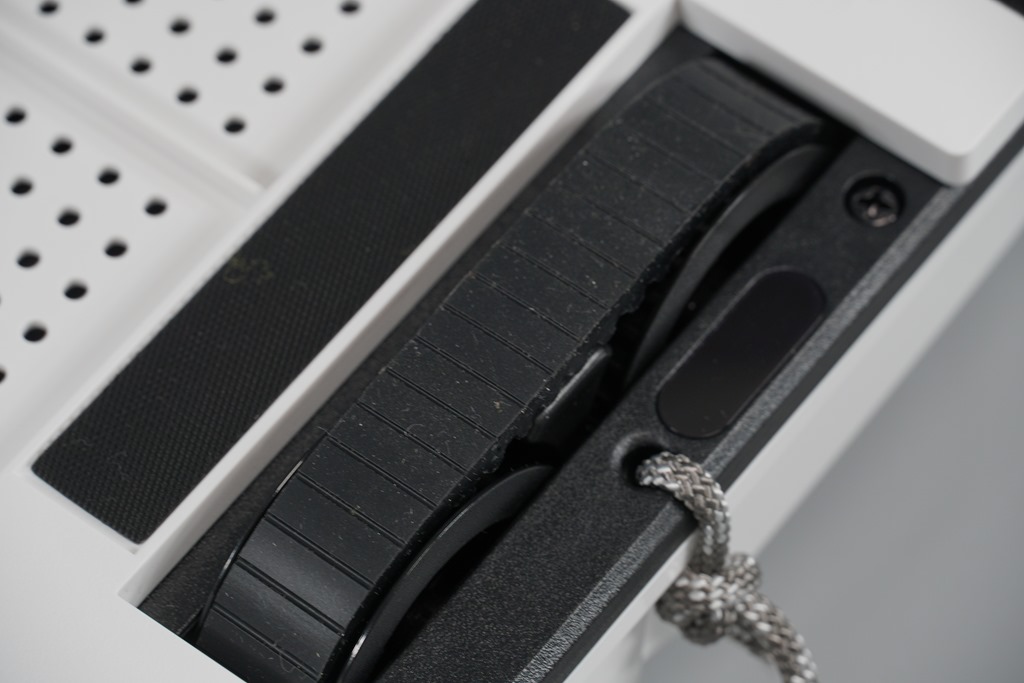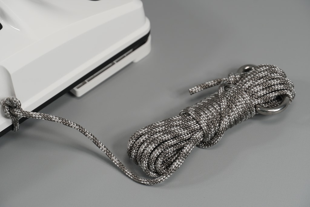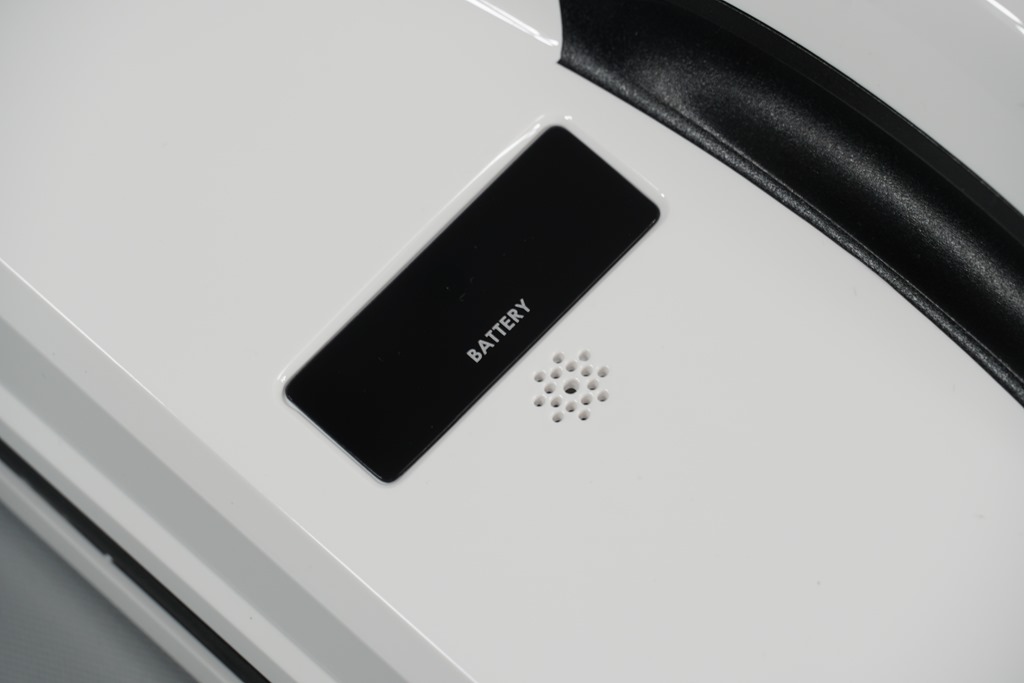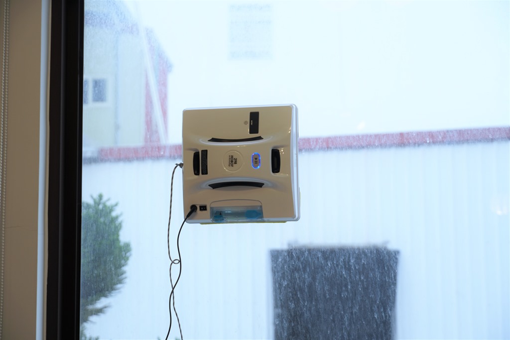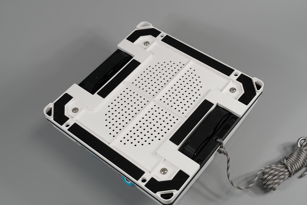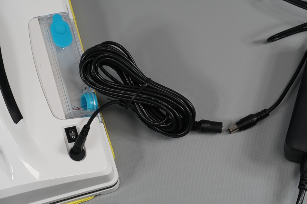 機身左上角有著電池狀態顯示器與蜂鳴器,大家應該覺得奇怪,既然都要插著電線,為什麼還需要電池?這其實是安全考量下所設計的,如果不小心發生了停電或是電線插頭被拔起來,機身內的電池電力可維持 20 分鐘吸附在玻璃上,並由蜂鳴器發出警報聲,提醒有狀況,這時候你可以利用安全繩將其拉回或是立刻插回插頭繼續使用。顯示器上會顯示電池正在充電或是充電完成,如果有異常,就會立刻顯示紅色燈號。