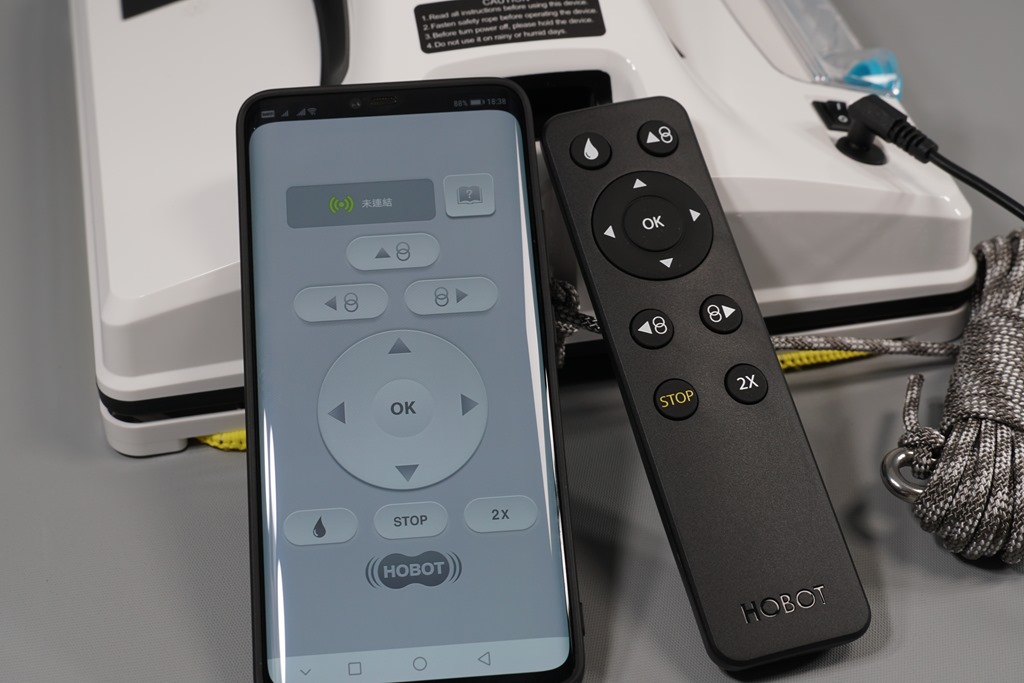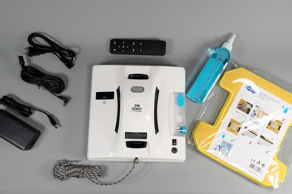 箱中的配件除了中間這台 24 公分見方的 HOBOT 298 本體外,本體上綁上一條 4.5 公尺的安全繩,可避免在由窗戶取下卸下吸力時失手墜落的意外,平常在運行時都有強大吸力吸附,並不容易墜落,但綁著安全繩還是必要的,除了保護產品安全,也保障路人的人身安全。箱中還配有三段式共長五公尺的電源線,讓清潔範圍更大。隨機還附贈三塊擦拭布與一瓶清潔液,另外還有可遙控操作的遙控器。