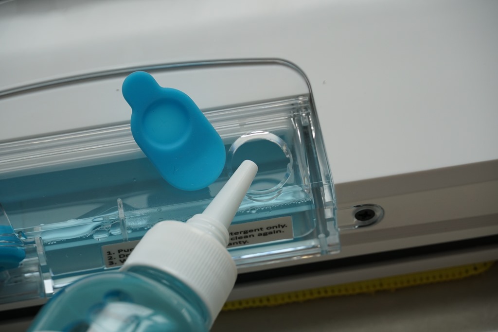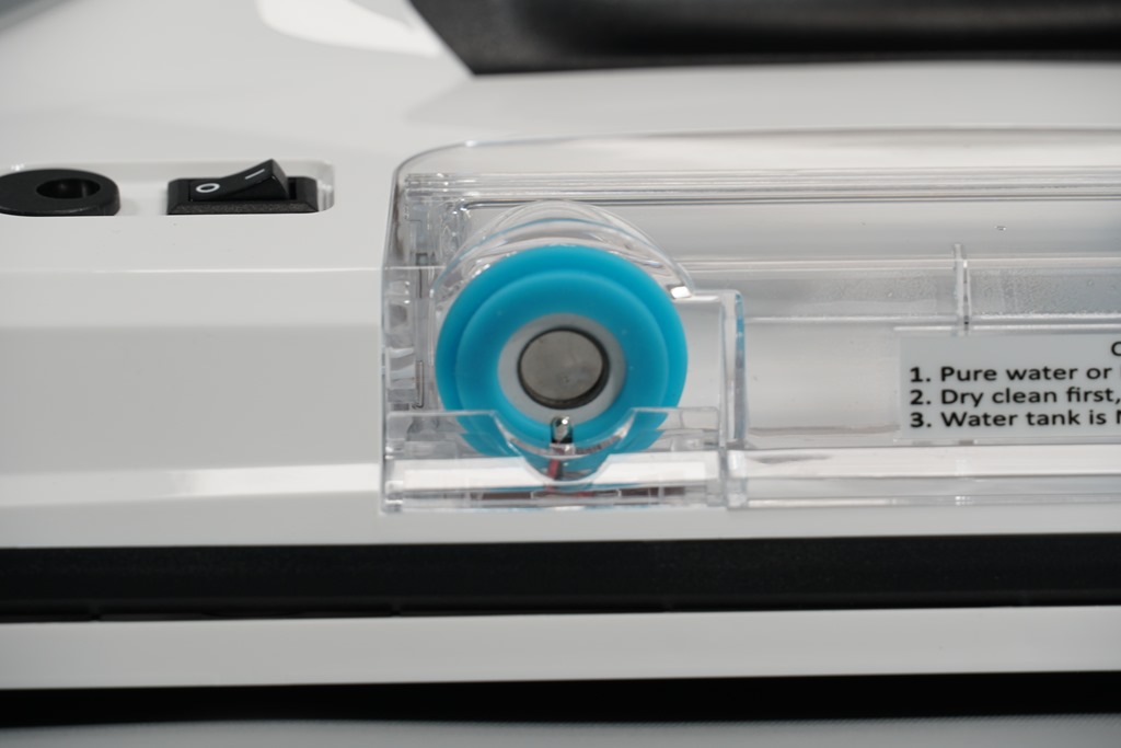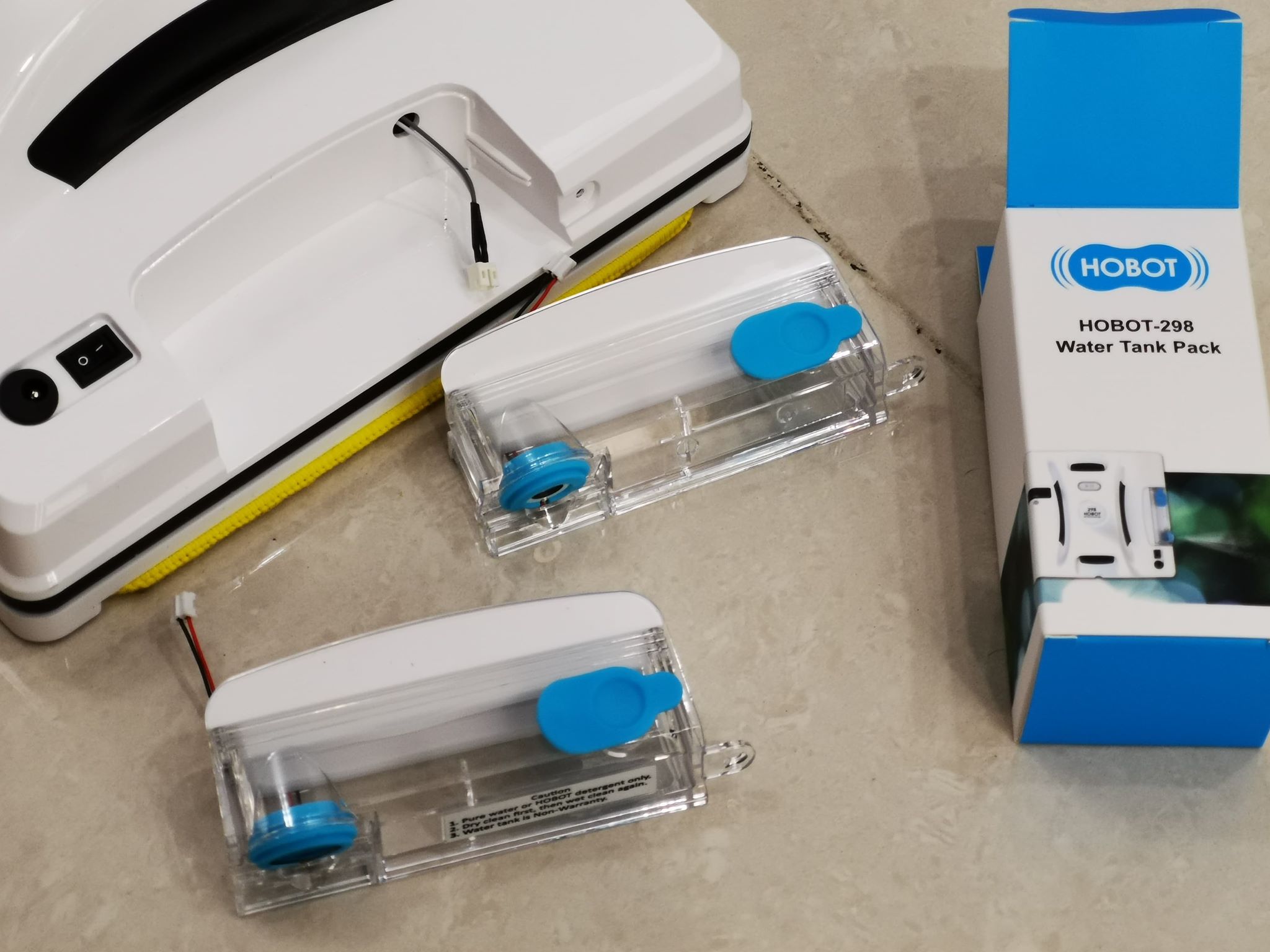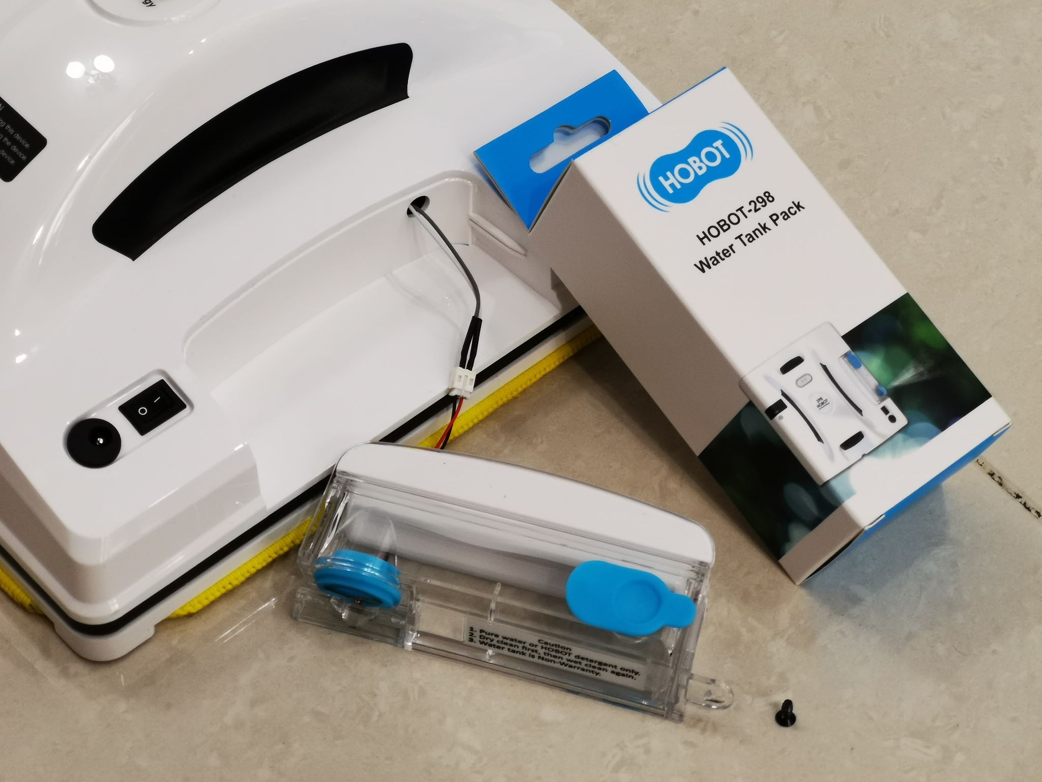 HOBOT 298 與與前一代HOBOT 288 最大差異就是在這個水箱與噴嘴,水箱雖然只有 40cc 容量,但因為使用超音波噴嘴產生 15 微米水霧灑水,用水量並不大,一次加滿水就可擦拭 40 平方公尺的玻璃,家中玻璃總和可能都不到 8 平方公尺,所以非常夠用。水箱中建議加入原廠清潔液或是蒸餾水,可避免噴頭阻塞,但萬一阻塞,還可以直接取下換上新的水箱,就可以讓機器人用得更久。