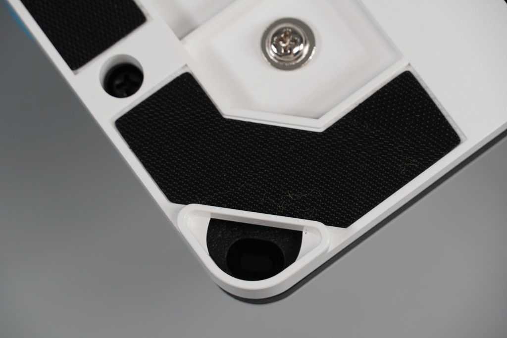 下方兩個角落有著雷射感應器,當在無邊框的玻璃帷幕上行走時,遇到邊界時就會以此為感應,避免繼續前行而失去吸力墜落。