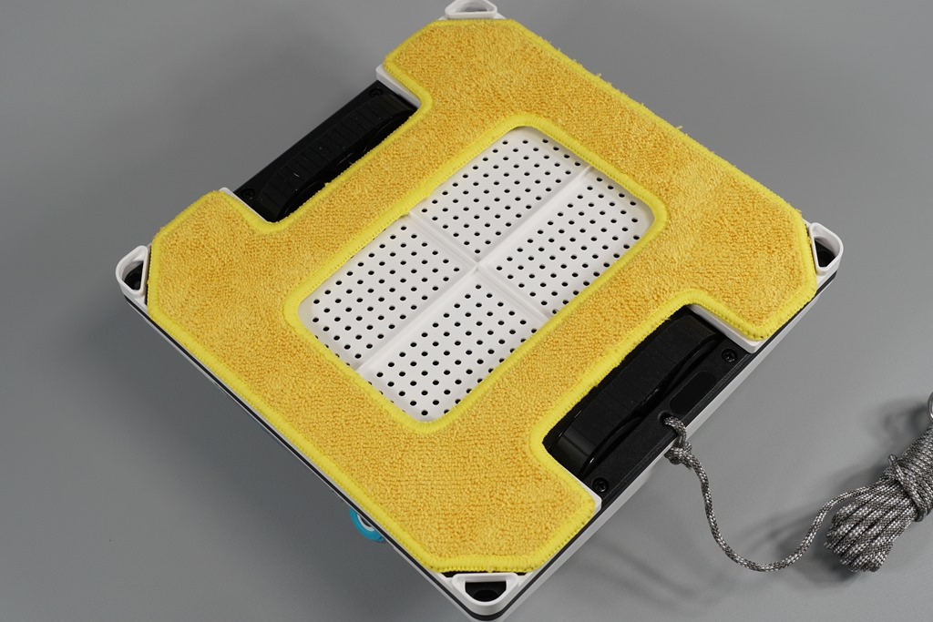 機身四周布滿魔鬼氈,這是用固定擦窗清潔布使用的,中間的孔洞是用來吸附玻璃的真空吸引裝置。