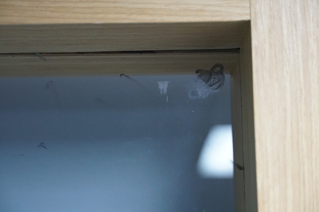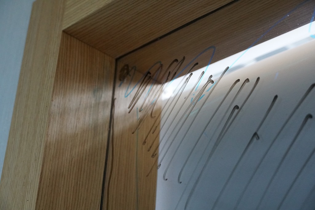 先在有框的玻璃板上用白板筆塗鴉,在邊角特別加重處理,看看 HOBOT 是不是可以幫我們連角落都清潔乾淨。