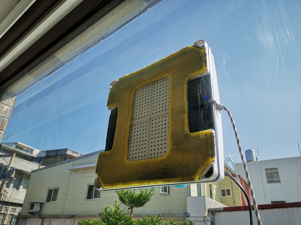 這樣髒的窗戶,直接用來測試應該就是最好不過的,先從窗內清潔起。HOBOT 298 擦拭了兩回後,用手指摸摸玻璃都感受不到髒污,但玻璃看起來還是很髒,原因就出在窗外那一面,實在髒到不像話。但清潔當天戶外濕度太高,造成機器打滑,所以就讓我休息一天隔日再戰。