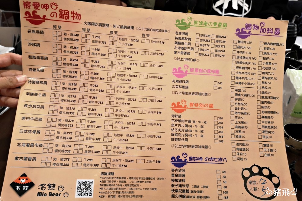 名熊鍋物的老闆娘其實來自嘉義民雄,因為思念家鄉也把店名取了民雄諧音,好讓她一解思鄉憂愁。2017年12月開幕,賣的小火鍋都是以當地現有食材入菜,不只新鮮價格也很評價,加上老闆娘親切招呼,已經累積一票死衷客人,三不五時就要來用餐。餐點分為火烤兩吃鍋物或是純火鍋,想要口味多店就點選火烤兩吃,想要喝湯多一些就點純火鍋。