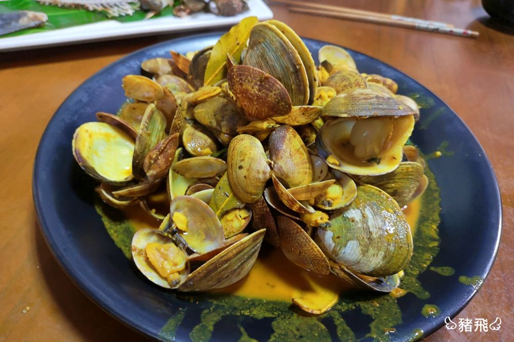 咖哩炒海瓜子:裡面有海瓜子、蛤蠣、牛奶蛤,用咖哩粉拌炒後香氣特別濃郁奔放!底下的湯汁集結了海鮮精華,好適合配白飯啊。