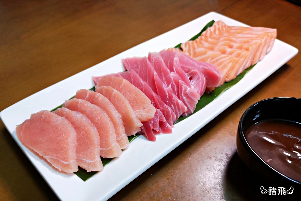 綜合生魚片:使用挪威鮭魚、日本築地黑鮪魚+旗魚,新鮮度很足夠,不用沾醬料也好吃。
