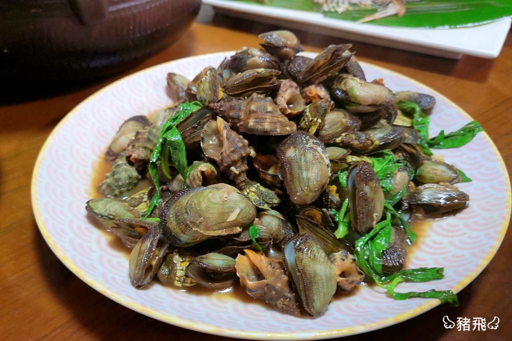 綜合炒貝:疊得像小山丘的貝類,裡面我認得出來的就是佛手貝,其他在台灣沒見過,用九層塔熱炒的綜合貝類是下酒菜!