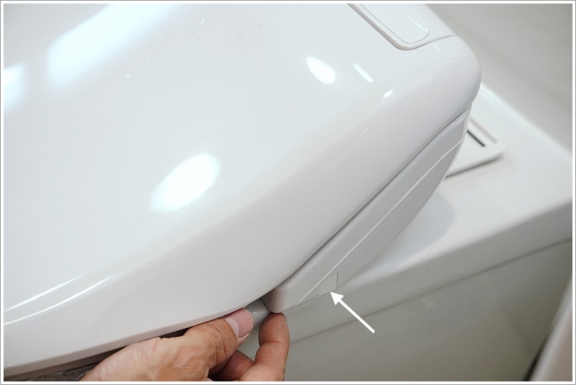 ▼安裝時很簡單,只要將坐便器對準方向後,往內滑向安裝板,聽到”喀”一聲即可;如果要拆除坐便器也沒問題,按住側邊的按鈕不放,就可以取出來囉!