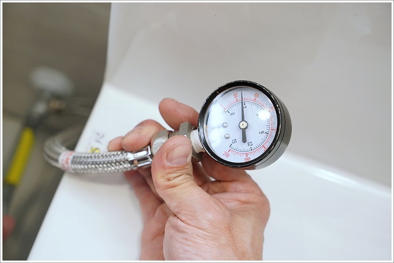 ▼裝機人員還會拿出儀器來測量水壓,通常介於0.7~7.5kgf/cm2都是正常的~代表可以正常安裝唷!