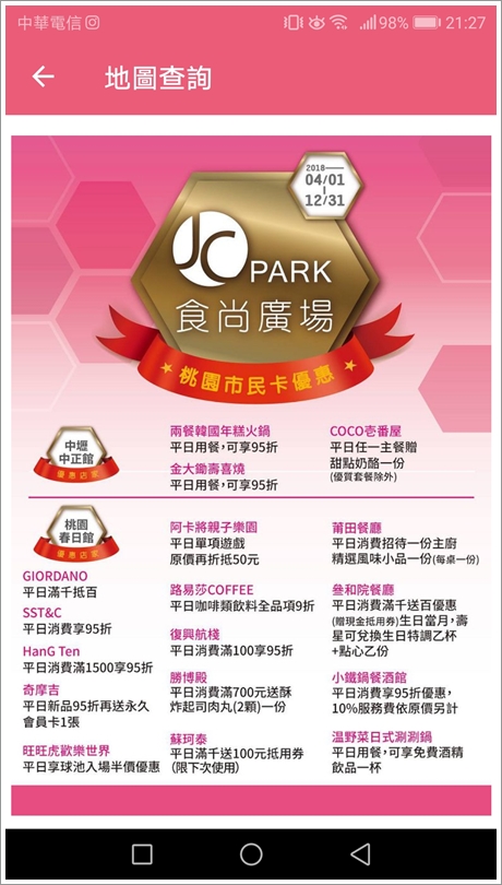 ▼JC PARK食尚廣場的優惠訊息在桃園市市民卡APP上也能看得到,所以無聊時滑一下就能知道下一餐要吃什麼惹(笑)~