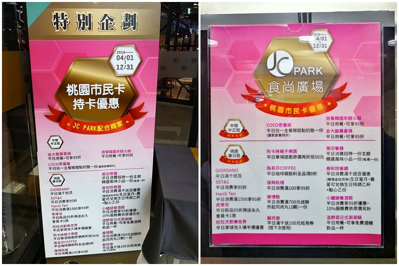 ▼另外現場服務台或是許多餐廳門口也都放有立牌,不僅餐廳都很踴躍參加,而且到處都有提醒告示,是一種不怕你用,只怕你不來用的概念啊!JC PARK不管是休閒服飾、餐廳或是遊樂場通通都有優惠折扣,加上我們大部份都是平日去消費,所以幾乎所有的優惠都能用得上!