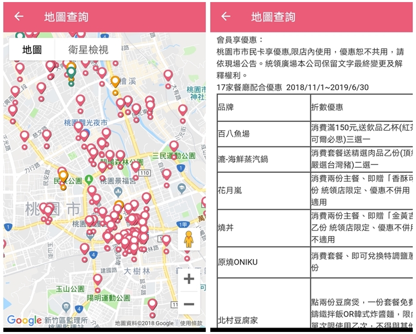 ▼除了有列表查詢之外也可以使用地圖查詢,就可以查到距離自己最近的餐廳優惠訊息啦!