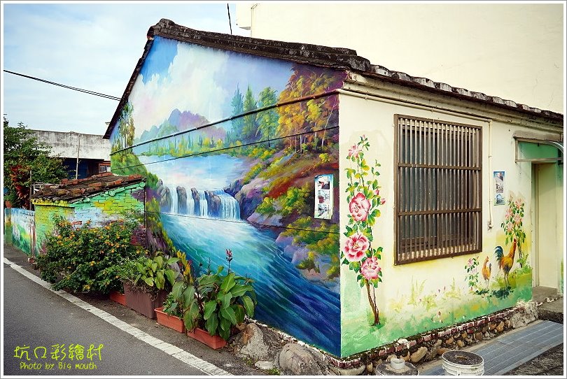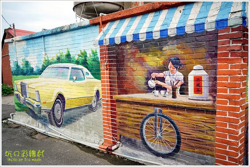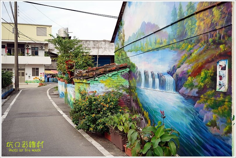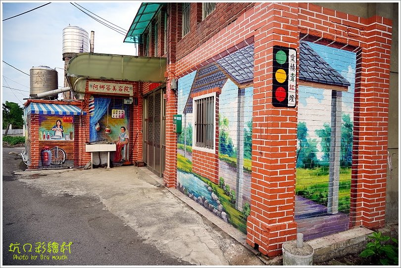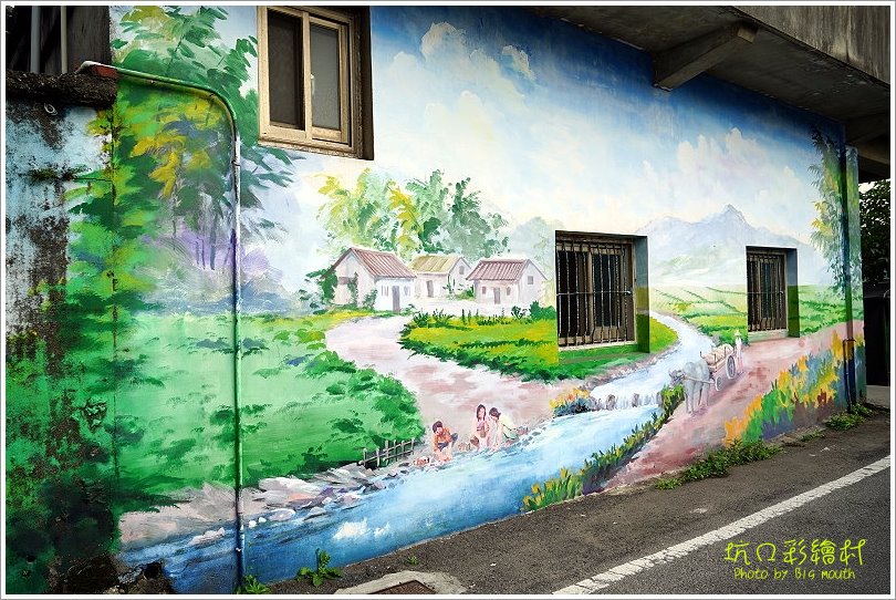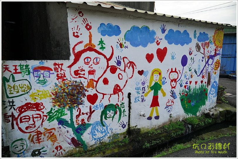 近幾年台灣非常流行彩繪村,尤其是可以互動拍照的話更吸引不少遊客特地前往!「坑口彩繪村」就位於桃園蘆竹百年宮廟「誠聖宮」旁,從「誠聖宮」周邊一直往外擴展到海山路、坑果路附近大概1000坪的範圍,順著路走每一處都有小驚喜!這裡的彩繪畫作以50~60年代的農村風情為主,像是三合院、拉牛犁田、灶腳、柑仔店等,跟在地的農村生活完美融合在一起;此外還不時可以看見天空有飛機呼嘯而過,對於小倆口來說是一個好玩有趣又可以拍照的好地方,加上很多彩繪牆都是可以互動拍照的,所以邊散步邊玩耍也滿不錯的~很適合帶一家大小一起來走走逛逛唷!