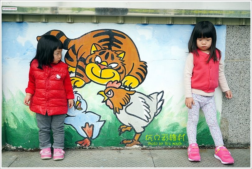 ▼接著看到這個公雞、老虎的彩繪牆面,小倆口也是超有興趣,不過小口愛這表情是…..小麻豆都流行這樣酷酷的嗎?哈!
