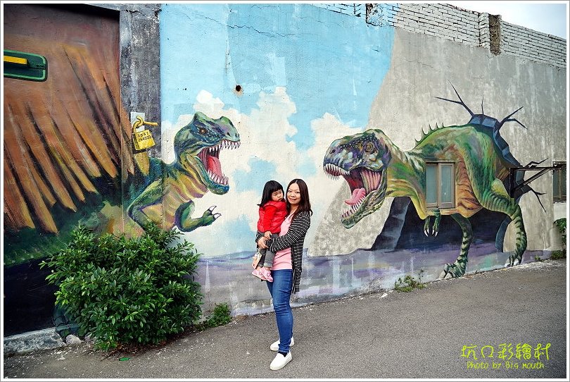 ▼竟然還有恐龍啊~栩栩如生的畫作讓小口妹既好奇又有點害怕,最後只好讓媽媽抱著拍照!