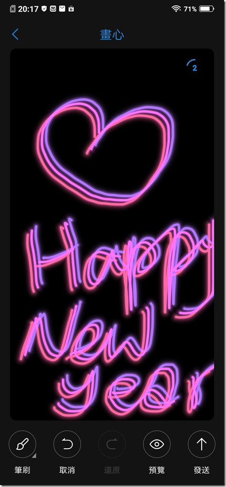 應用雙螢幕設計,vivo 設計了很有趣的手勢操作,比方說「心情傳遞」就可以利用雙螢幕來傳情,在待機的狀態下在正面螢幕畫愛心,接著就可以利用不同的筆刷在螢幕上寫字或畫圖,完成後就可以傳送到後面螢幕,非常奇特有趣的溝通方式。
