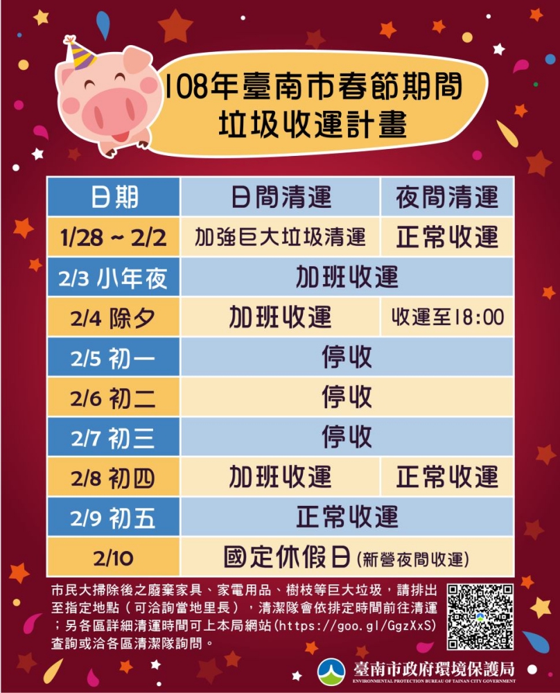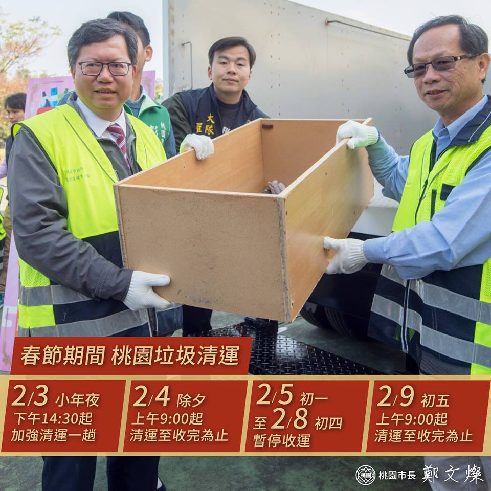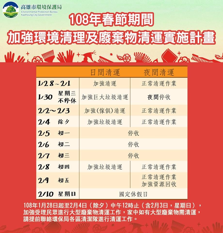 2月4日(除夕)、2月9日(初五)等2日,因應春節4天停收垃圾前後之垃圾量暴增,垃圾收運時間將下午時段調整至早上時段、晚上時段調整至下午時段,採沿線收集、機動調度方式,以滿足民眾傾倒垃圾需求。