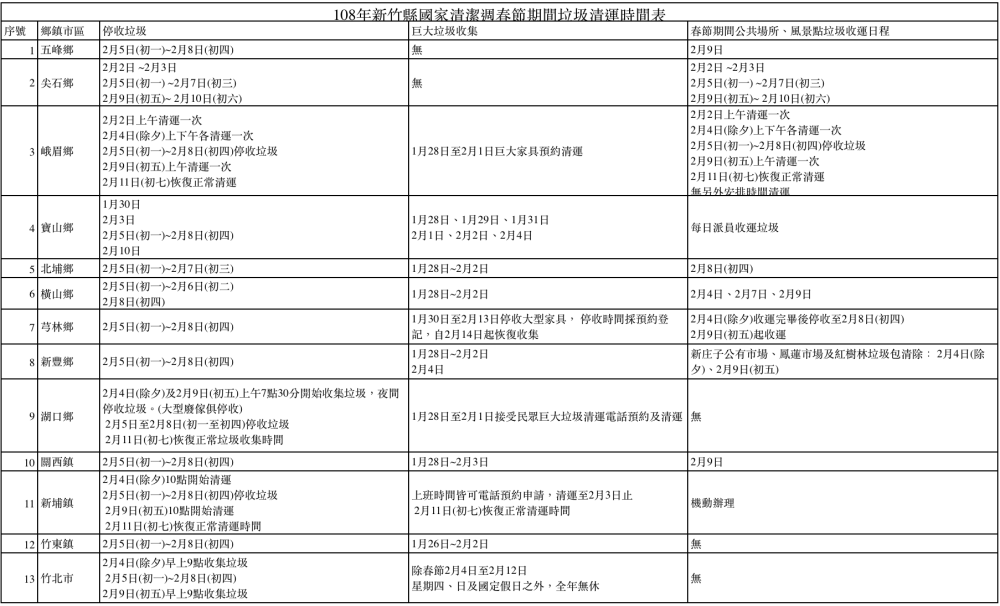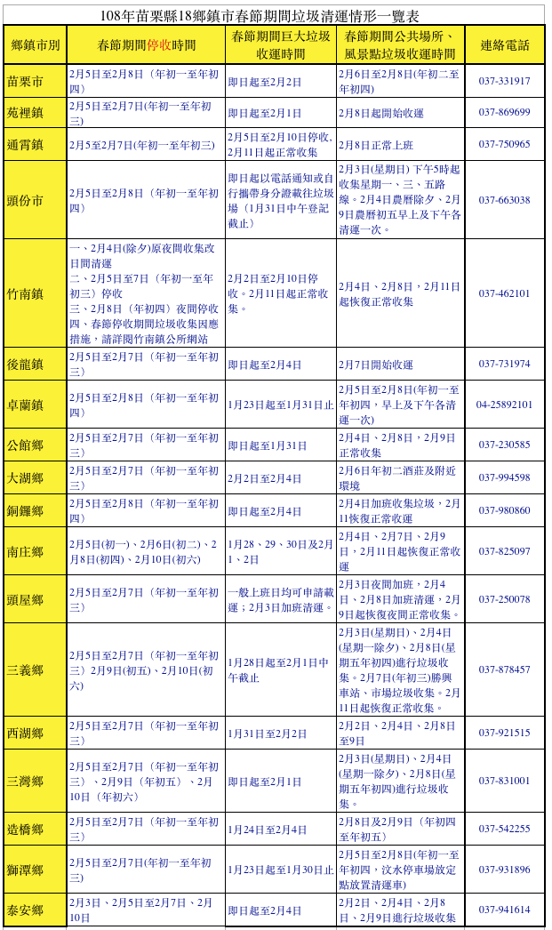 108年農曆新年將至,為方便鄉親過年大掃除,家中乾淨好過年,苗栗縣政府環境保護局彙整全縣18鄉鎮市公所春節假期垃圾清運資訊,以供民眾做為參考,依鄉鎮市公所提供之清運時間表,各鄉鎮市於除夕當日仍正常收取垃圾,但因本次春節假期較長、各公所人力調度及輪休不一,因此請鄉親參考環保局提供之彙整表,或向所在地公所洽詢,依各公所規劃時間,投丟垃圾。