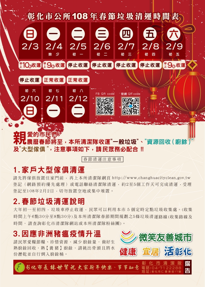 108年2月8日(初四)恢復正常運作,下午14點至16點清運。