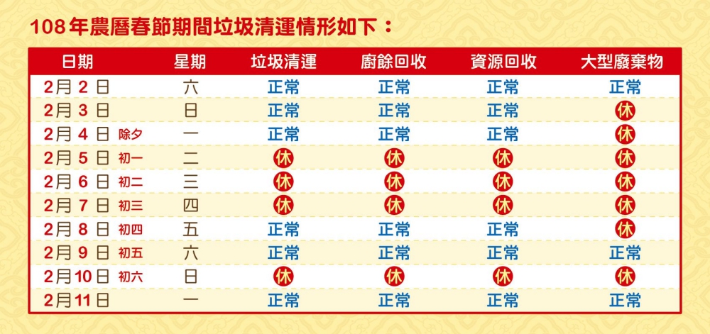 5. 2月8日(農曆初四星期五)恢復正常收運垃圾、資源及廚餘回收工作,當天下午加收一班垃圾車。