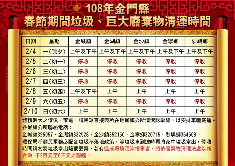莒光鄉:108年2月4日(除夕)上午時段正常清運,下午提前至16點開始清運。