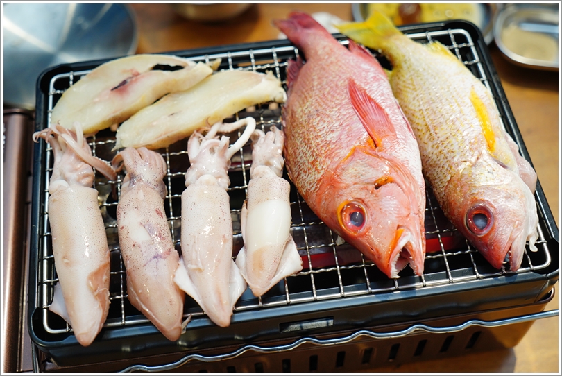 ▼開烤啦!我們先將鮮魚、小管跟魚片通通放上烤網,瞬間就擺滿了(笑)!小管已經是熟的,所以只要烤熱就可以享用啦~吃起來軟Q鮮美,搭配醬料更是提鮮好吃!