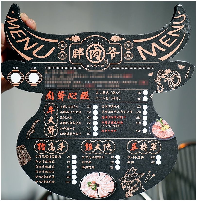 ▼菜單,特別做成牛頭造型的感覺,一整個超有FU!這裡有提供各種牛、豬、雞、羊的肉品,通通58元起;此外還有豬心、豬肝20~30元不等,真的是超親民的價格啊!