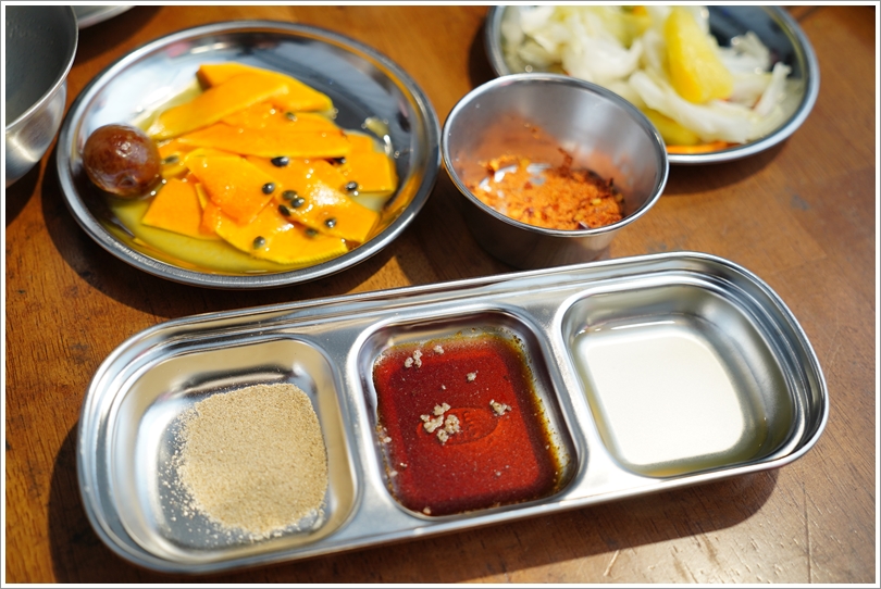 ▼每人都會有一份調味料,由左而右分別是胡椒鹽、特調醬油、檸檬汁,讓大家可以搭配肉品享用!