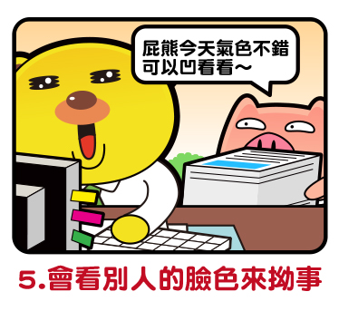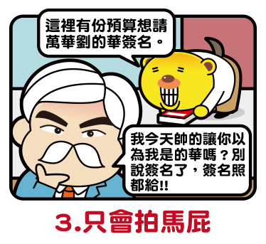 拍馬屁的招術還不是人人都會的,要表現的熱情又嘴巴甜,讓人陶醉在這謊言中,必要時會刻意親近上司,再偷打你的小報告,他們總是有辦法提昇被上司的寵愛指數。