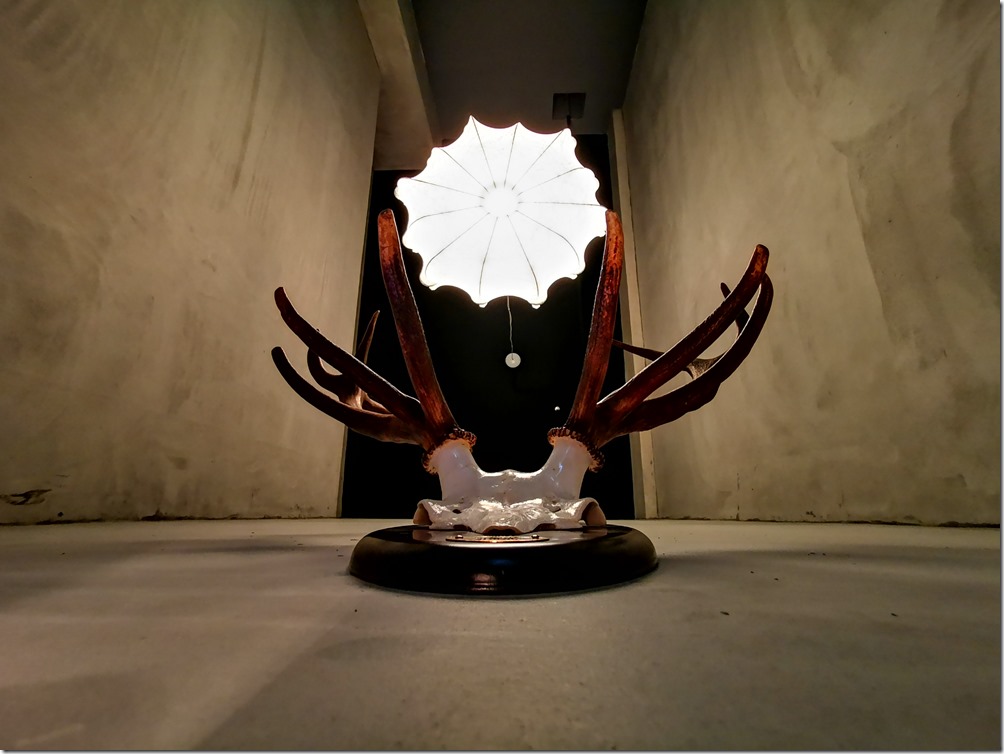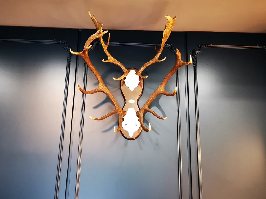 之前在小巨蛋店時,就有看到牆上掛著鹿頭,這是 Jerry 法國獵人朋友特地送來台灣給,而在台中歌劇院店開幕,除了樓梯轉角這鹿頭外,還有一個象徵幸運的雙鹿頭。雙鹿頭不是鹿有兩個頭,而是一次狩獵到兩頭鹿,這對於法國獵人來說是很難得的,他也將這幸運送來台灣給每個光臨的朋友。