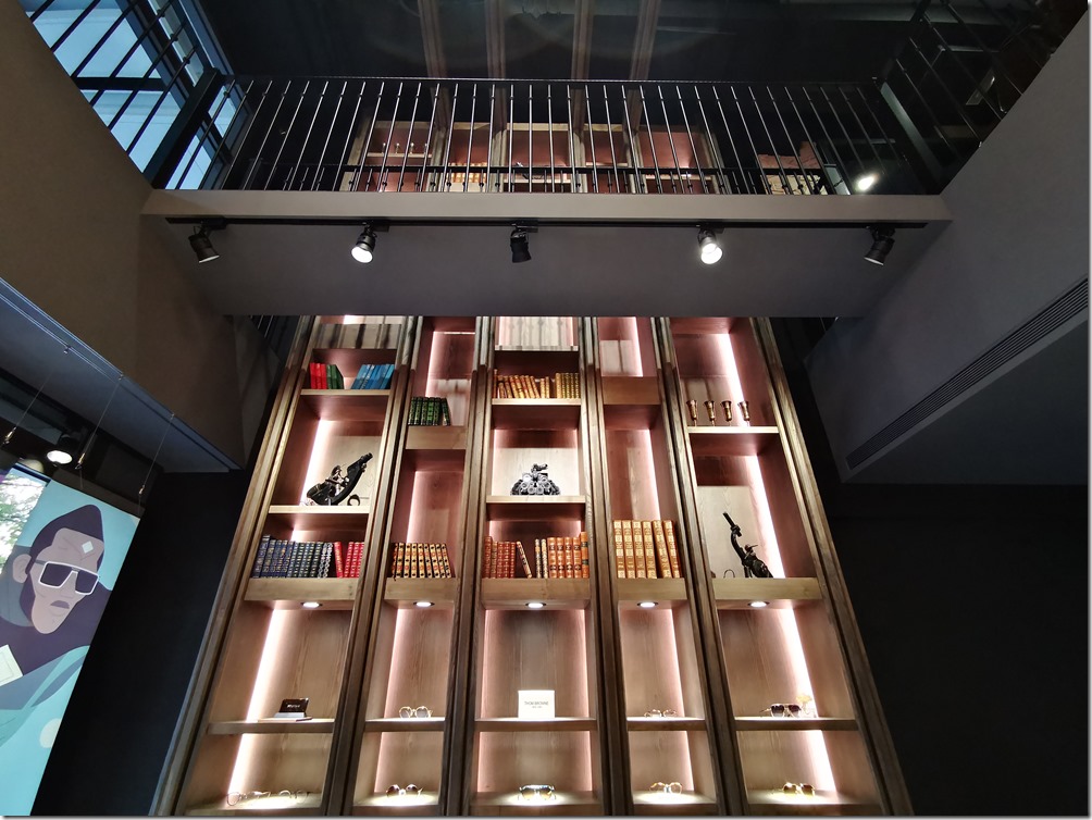 另一側的品牌鏡架展示櫃如果只從一樓看並不會感受到特別厲害,但從二樓休息區往下看,你就會發現這展示櫃非常了不起,是貫穿一二樓的超大書櫃,上面所擺飾的書與驗光儀器,都是從各國蒐集來的古董。對了,從一開始認識老闆 Jerry 後,明明就知道他是科班出生的驗光師,但每次看到他挑選產品、擺飾品與店內規劃的龜毛程度,我都還是會再問他一次,你真的不是室內設計相關科系畢業的?