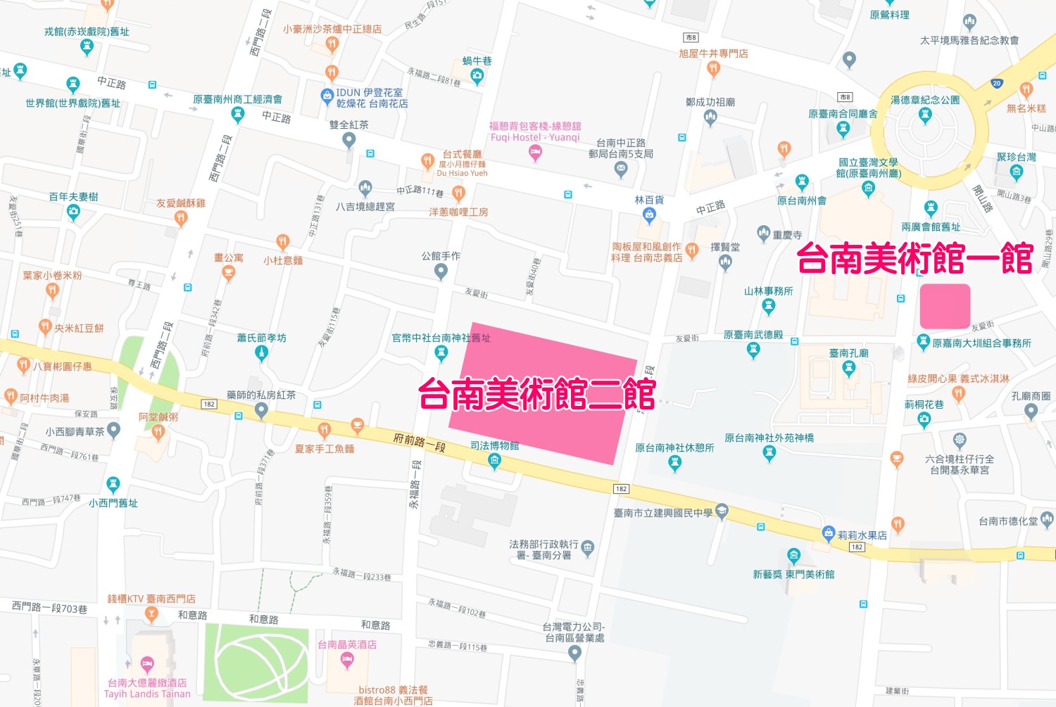 台南美術館一館&二館都在台南孔廟旁邊,地下停車場入口在府前路端,美術館旁也有T-bike的租借點,交通是相當便利的地點。如果想搭公車,從台南火車站搭乘1、2、6、7、10、11、88、高南E08號、高鐵快捷H31公車至民生綠園或孔廟站,走路約3~5分鐘即可到達。