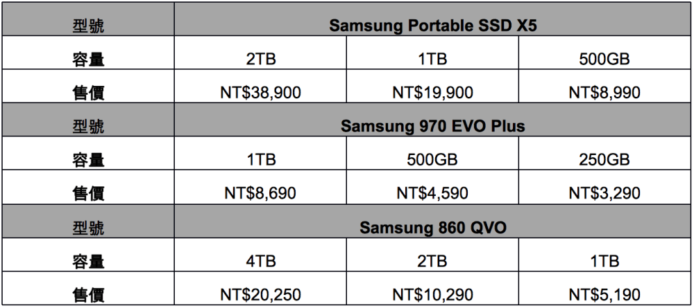 Samsung Portable SSD X5將推出500GB、1TB與2TB三種容量規格,售價分別為 NT$8,990、NT$19,900及NT$38,900;Samsung 970 EVO Plus包含250GB、500GB與1TB三種容量規格,售價分別為NT$3,290、NT$4,590及NT$8,690;Samsung 860 QVO則有1TB、2TB與4TB三種容量規格,售價分別為NT$5,190、NT$10,290及NT$20,250(表一)。三款全新固態硬碟將於2月底正式於燦坤、順發3C、三井、良興、原價屋以及PChome網路家庭等通路販售(註一)。