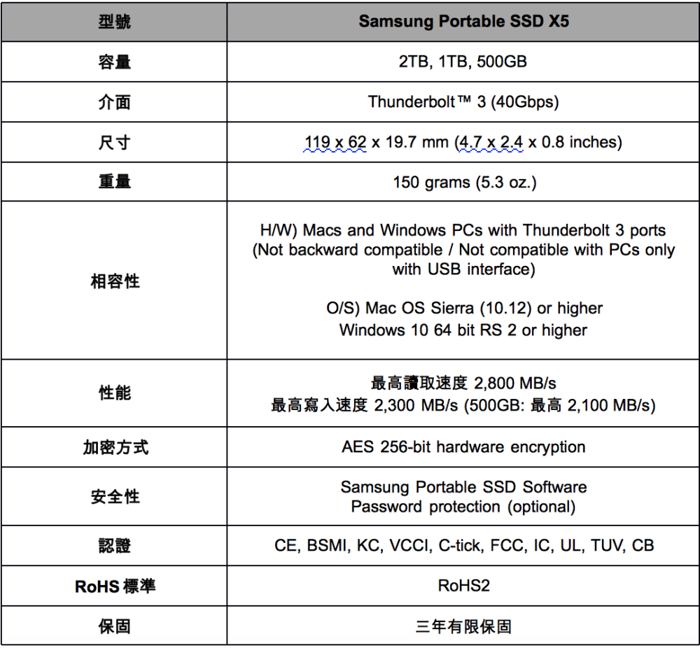 【新聞附件1】Samsung Portable SSD X5產品規格表