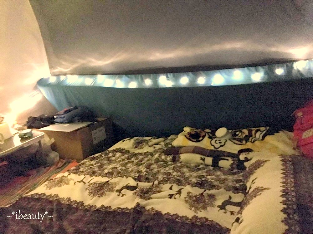 帶了張小桌子、電暖器(對,你沒看錯,冬天露營沒暖氣會冷死!但是有暖氣就真的暖呼呼~~)、電熱水壺、很多毯子(原本防水的軟墊和有鋁箔層的底墊還是很必要的喔)、竟然還帶了兩顆飯店級的羽絨枕,接上筆電,窩在被子裡,躺著看電影、喝著TWINING的香草茶,掛著可愛的雪花星星LED燈,真的是舒適得很令人驚訝~~~~(小時候露營,阿爸的裝備非常陽春,只有防水墊、一兩條毯子、睡袋、小營燈,搞得我們一家四口,大過年的半夜在阿里山的停車場旁,冷到發抖,最後撤回車上睡覺,隔天早上醒來,收帳後才發現底下竟然有一層薄冰……我真的是哭笑不得阿!)