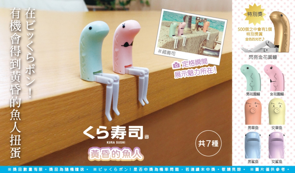 為此,在2019年開春之際帶給消費者更多的趣味體驗,台灣藏壽司將推出“黃昏的魚人”全新扭蛋,全系列共7款 – 男女鯊魚、章魚、花園鰻及1款閃亮金花園鰻,修長的兩條美腿可自由呈現端正坐姿、朝天跪姿等俏皮動作,如端坐在辦公桌演繹blue Monday,優雅翹腳坐在咖啡杯沿、坐在藏壽司餐盤上,呈現飽肚畫面,或是蒐集多款做出幽默版“拜月式”瑜伽動作,都讓藏壽司專屬的「餐盤回收扭蛋抽獎系統」為大小朋友增添生活風趣!“黃昏的魚人”扭蛋將於2月26日全台藏壽司同步登場,勢必又將再掀起蒐集風潮,大玩創意演繹各自心聲的風趣畫面!