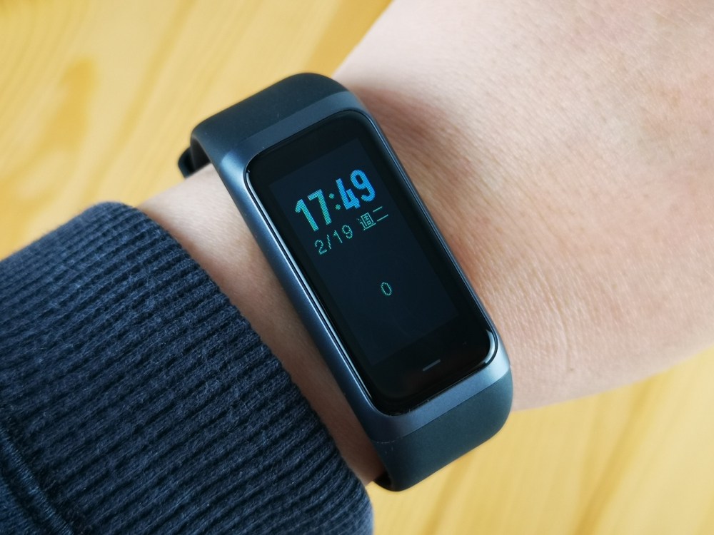 手環表面是1.23吋的彩色LCD顯示螢幕,螢幕上蓋覆蓋一層2.5D玻璃,是一塊經由弧度處理的平面2.5D玻璃,螢幕四角也有弧度,在視覺與觸感都比入門款的運動手環質量高。螢幕下方的 __ 為觸控按鍵點。