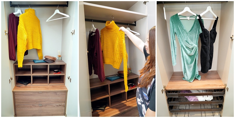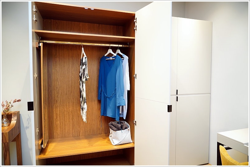 ▼打開一看,不僅衣架高度非常剛好,連口咩也能輕鬆拿取~除了增高櫥櫃內的使用空間,下層再搭配鋁框抽屜與拉籃架,既可以看清楚各層衣物,還可以靈活運用,達到衣物分門別類收納的最高效率!
