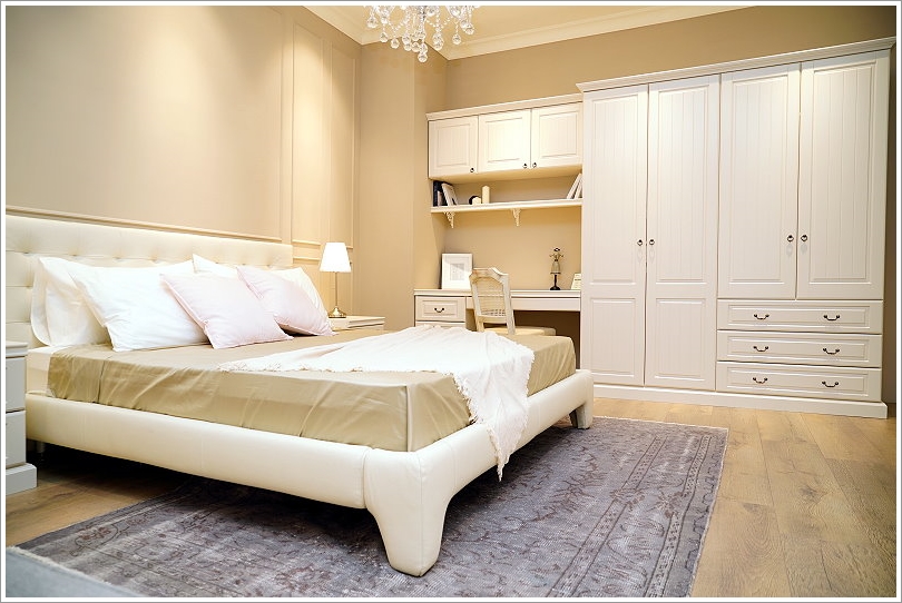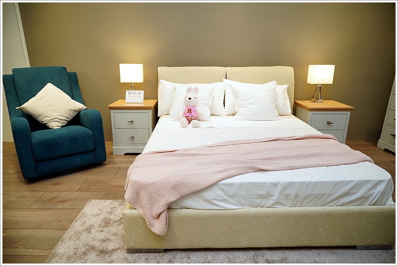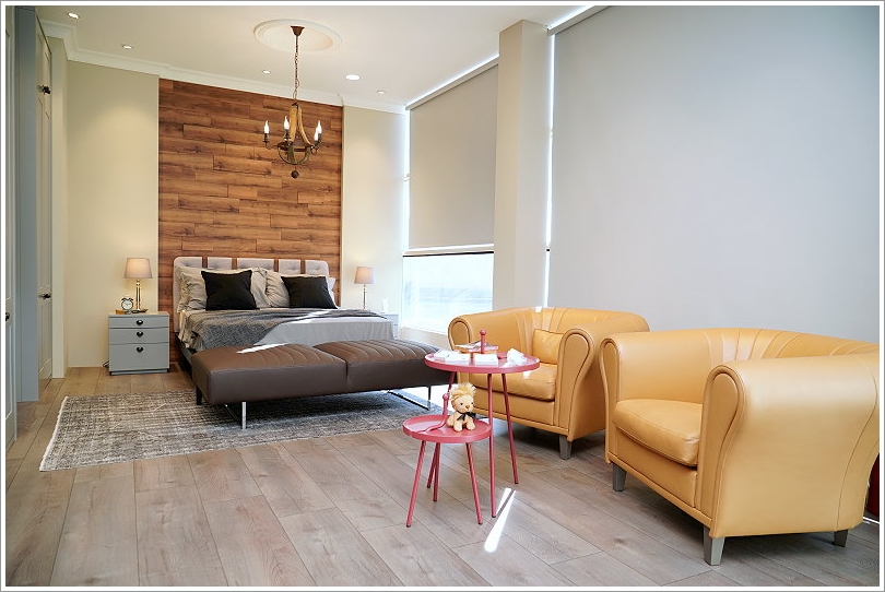 ▼這是另一個臥房的情境模擬,感覺滿適合女孩兒或是夫妻一起使用的空間,大地色系搭配白色、木質感都很合拍,一旁的單人沙發椅則是選擇較為跳色的藍綠色,看起來顯眼又有質感!
