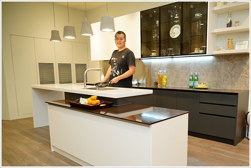 ▼他們的廚房規劃不僅營造出視覺的美感,連實用度也考慮進去了!像是工作檯面、中島的空間都非常夠用,另外上頭及下方也都有可以收納的上下櫃,像我們很常兩個人在廚房一起料理,這樣的空間就綽綽有餘啦~不僅不會互相干擾,且亮面的檯面在清潔上也非常方便!