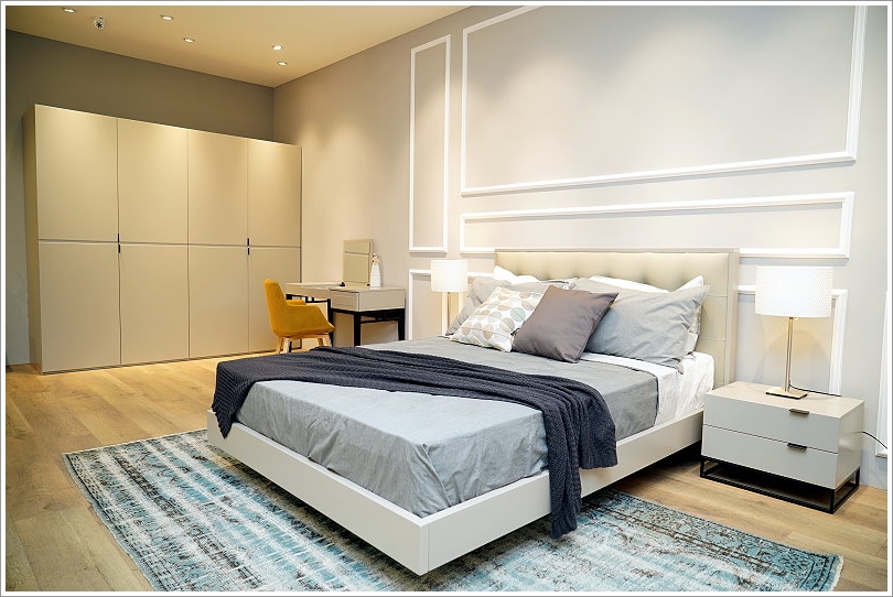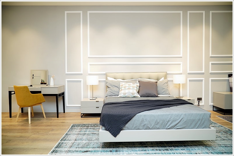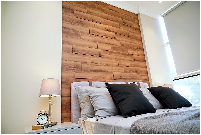 ▼床後方的牆面裝飾板還是採用浮凸效果,看起來更加立體有層次,可見連細節都非常用心,讓實境看起來更加細膩又真實!偷偷讓大家知道,此床頭板材可是預計要上市的新品,在環中門市讓大口搶先目睹啦!