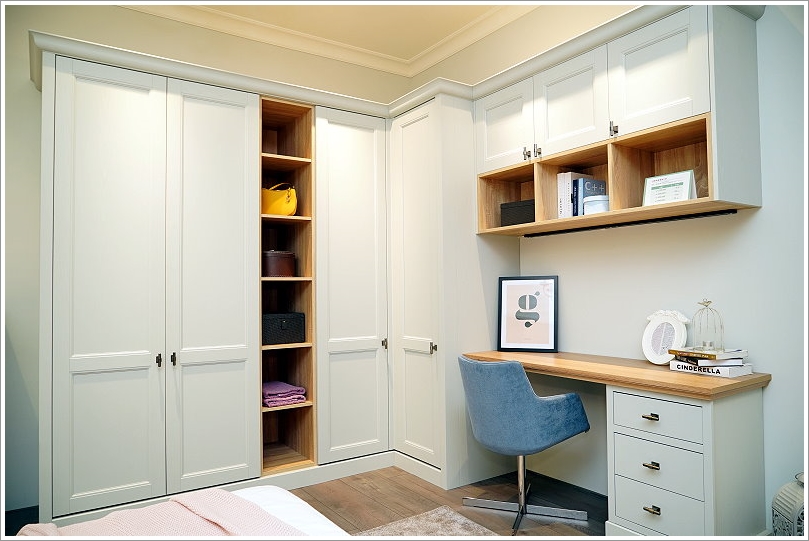 ▼臥室旁的衣櫃、桌椅及置物櫃都一併幫你設計好了,延續米白色調,桌板搭配木系材質,看起來溫潤又有質感~椅子同樣延伸跳色的藍綠色,使用Estel 經典Divina暢銷單椅,讓整體房間風格非常一致又有彼此呼應!櫃體為Kindred英式鄉村Chapter系列,特別嚴選歐盟認證E1板材來打造各式衣物櫥櫃,以柔和的色調搭配優雅的天然橡木,加上特色金屬門把,看起來古典細膩又精緻!
