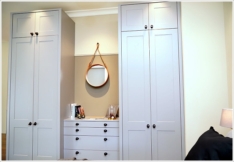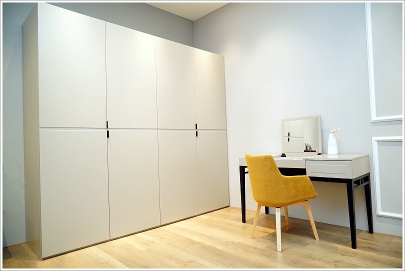 ▼Plano衣櫃與梳妝台也都是走簡約又時尚的路線,衣櫃是採用表層烤漆與胡桃木的組合,看起來俐落又優雅;不過因為這個衣櫃有尺寸及安裝考量,所以需要現場確認規劃,不列入單品銷售!梳妝台鏡子下方還可以直接放入保養品及彩妝品,化完妝直接用鏡子蓋起來即可,完全不用收納,很得口咩歡心(笑)!且不管是衣櫃的拉門或是梳妝台的鏡子都是有緩衝設計,不僅不容易夾手也比較安靜!