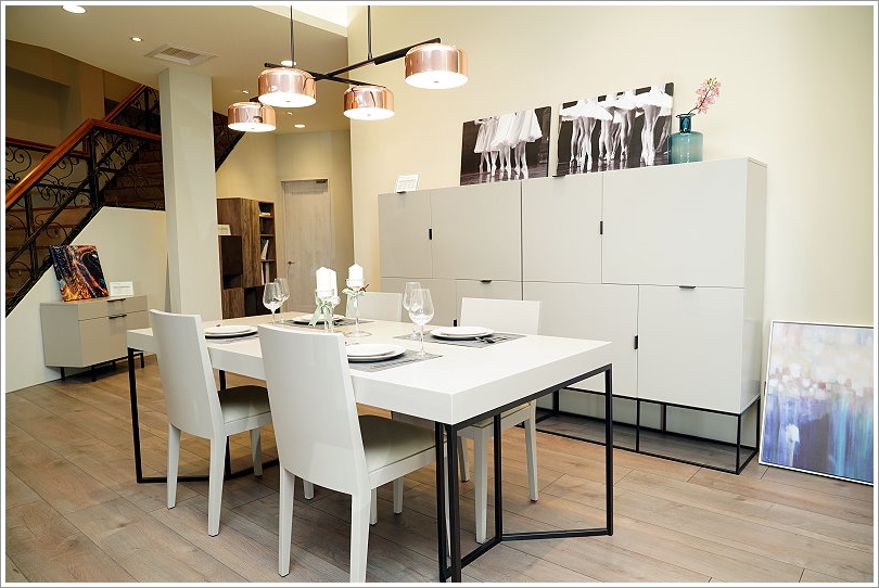 ▼Plano餐桌、餐椅、高櫃,整體搭配起來前衛又俐落,時尚又兼具質感!其中的燈具為Seed燈飾,此燈具還可以調整角度與排列方式,使用上十分靈活方便! 也是可以自由選購搭配。