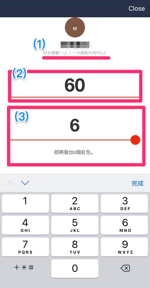 (2) 如果是想要發給群組好友,畫面上會有三個欄位,分別顯示群組中有多少人,又有多少人有使用一卡通,、想要發送的總金額(一個人 $1 也可以,但是要手動輸入)與想要發送的人數(用拖曳的)。