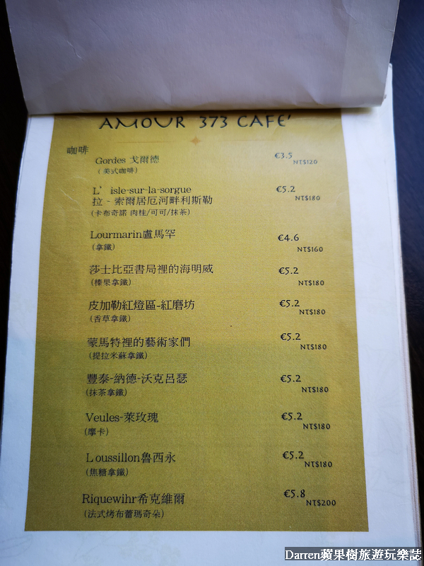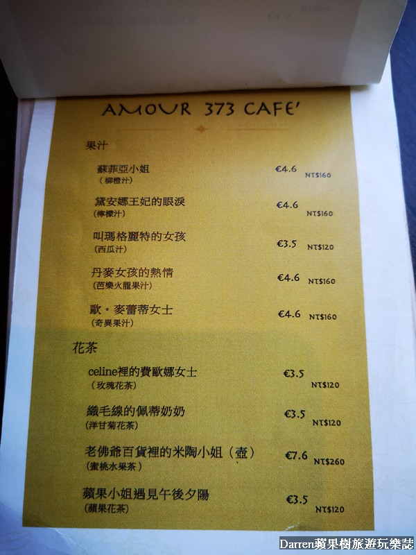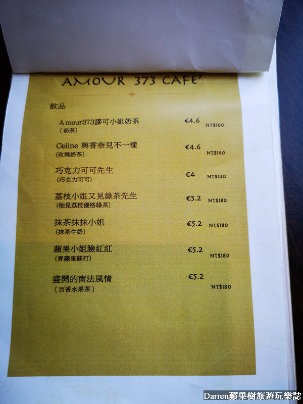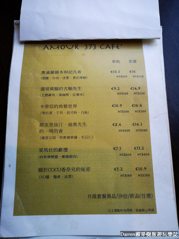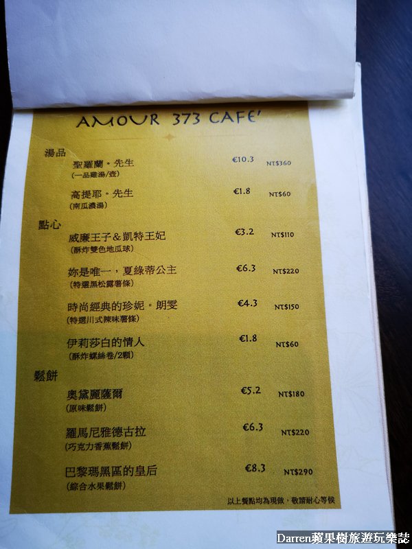 阿沐373咖啡菜單,提供餐點、湯品、點心、咖啡、飲品等,比較特別的是menu上還用金額以歐元來計價,旁邊也有標示出新台幣,基本上價格跟常見的景觀餐廳差不多,另外提醒阿沐373咖啡低消是每人150元。