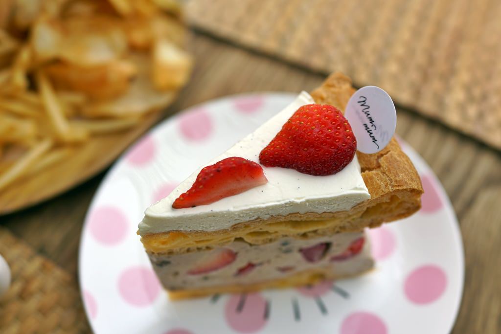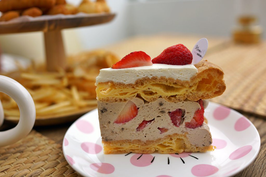前面有提到,這次想來二訪就是因為它!自從草莓季開始,我的IG就狂被這款蛋糕洗版,正因為對它期望很高,吃了一口就失望了,泡芙口感完全NG,太過軟塌,而且相當的乾,卡士達內餡好像加了香蕉泥,覺得味道很不搭,總之,這款蛋糕真的沒有很好吃,哭哭。