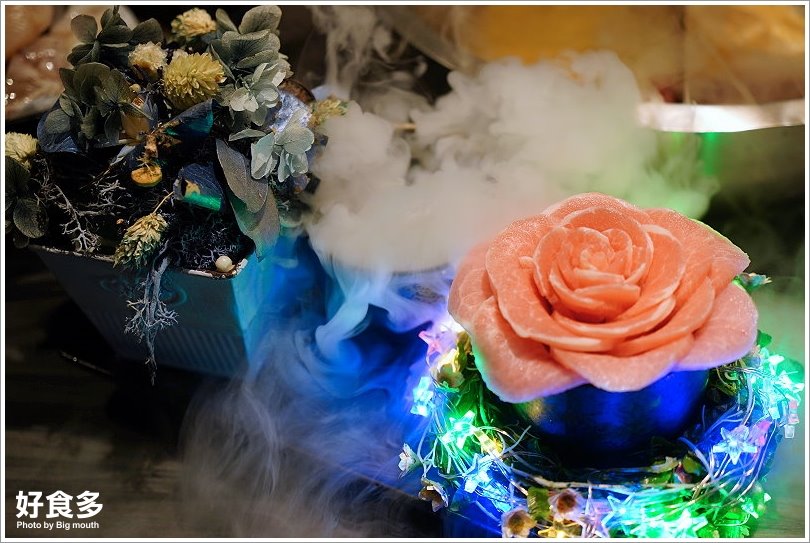 ▼雖然是壽星贈禮,但感覺得出店家非常用心!玫瑰松阪豬花不僅同樣花好長一段時間製作,再加上盤器、花藝、燈飾與乾冰一起上桌,看起來夢幻又吸睛,就好像收到一份精心準備的禮物一樣,讓人非常開心啊!